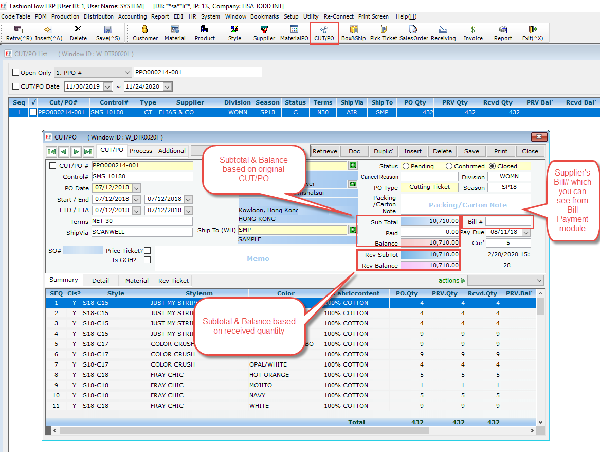 You can find subtotal based on original PO amount as well as received quantity based subtotal which can be different and also here you can enter supplier’s bill number so you can see it from “Bill Payment” module