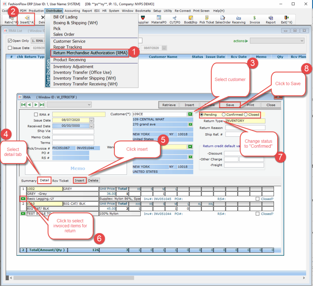 - Click “Insert” to add a new RMA